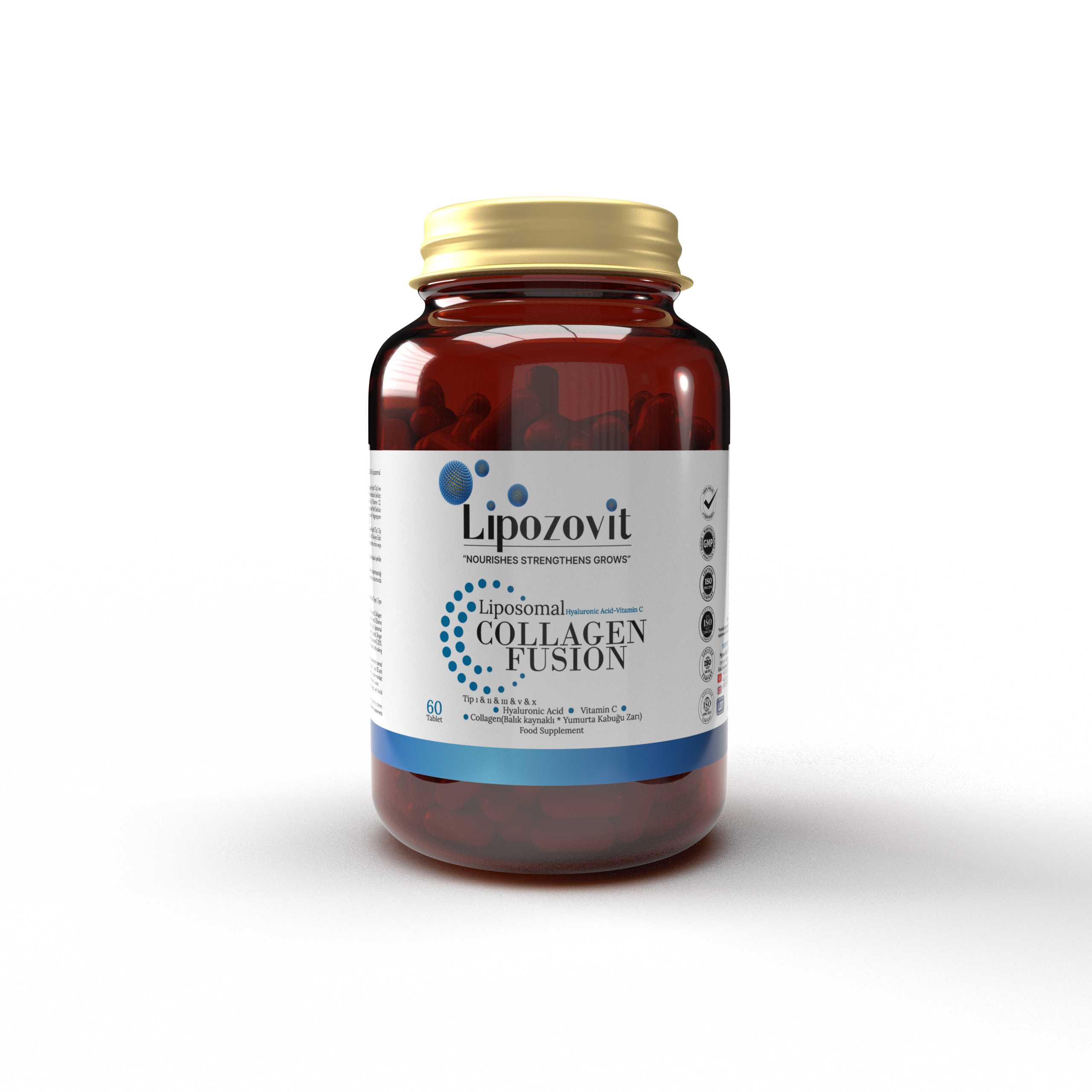 TAVSİYE EDİLEN GÜNLÜK PORSİYON MİKTARI: LİPOZOVİT COLLAGEN FUSİON MARKALI VE KOLLAJEN PEPTİT (TİP 1, TİP 2, TİP 3, TİP 5, TİP 10) VE LİPOZOMAL HYALURONİK ASİT İÇEREN TABLET TAKVİYE EDİCİ GIDA İSİMLİ TAKVİYE EDİCİ GIDA YETİŞKİN KULLANIMINA YÖNELİK (18 YAŞ VE ÜZERİ BİREYLER İÇİN) OLUP TERCİHEN YEMEKLERDEN ÖNCE VEYA SONRA GÜNDE 2 KEZ 1 TABLET, YETERLİ MİKTARDA SU İLE ALINMASI TAVSİYE EDİLİR.